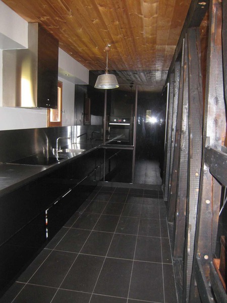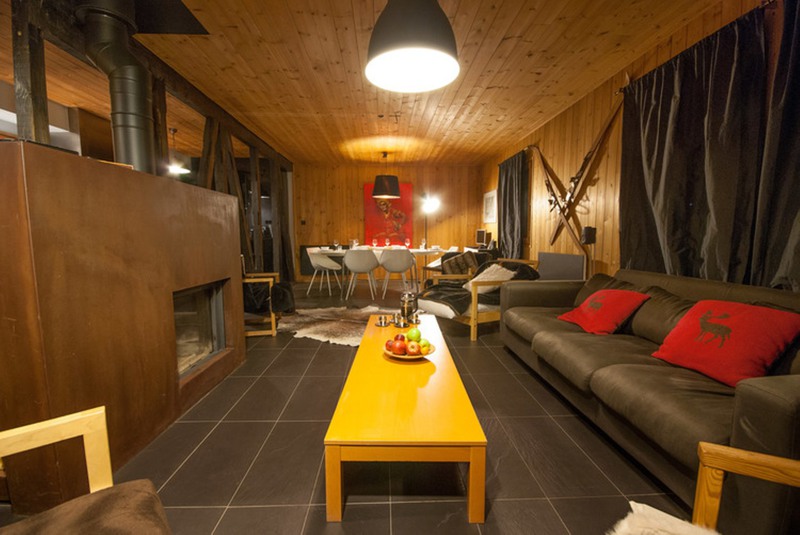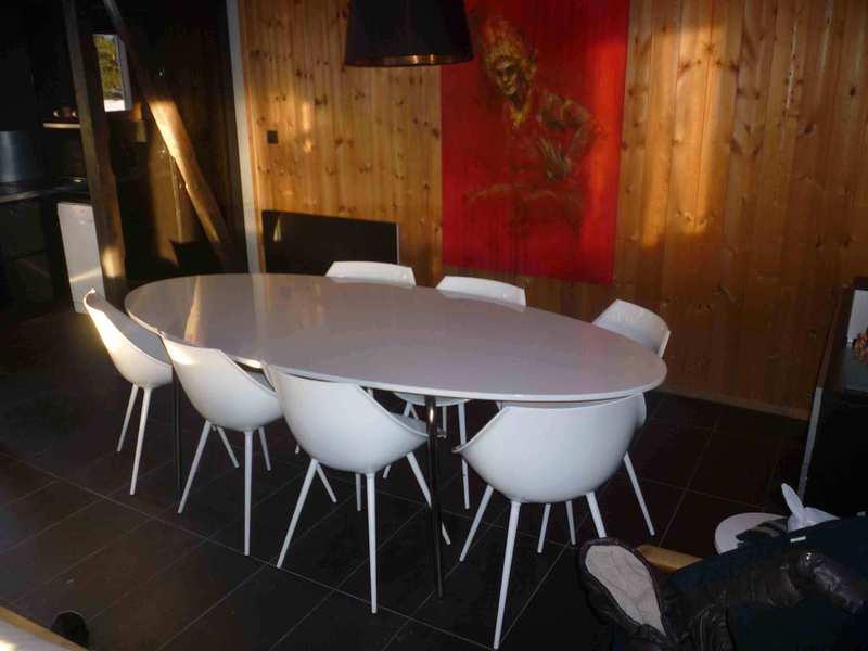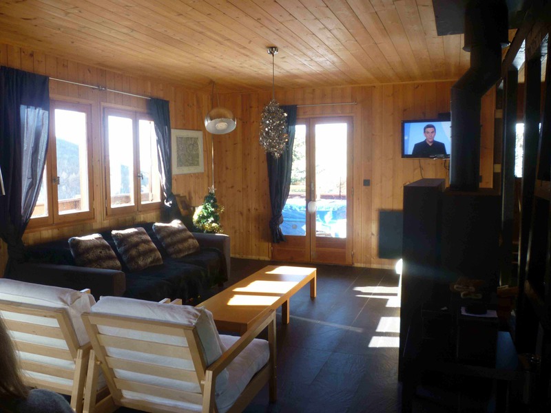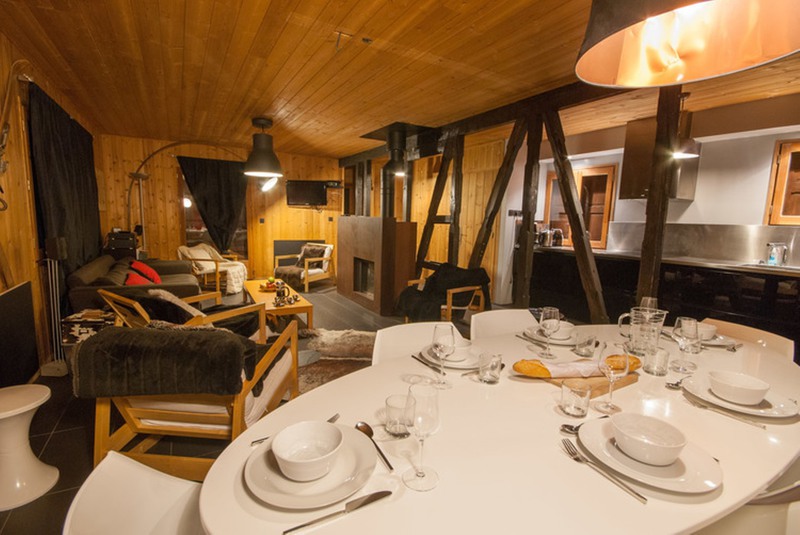 cheminée , salle à manger et cuisine ouverte moderne et haut de gamme. Exposition sud, très belle vue sur la montagne et les pistes de ski. Grand balcon.