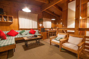 Portemanteaux et râtelier à ski – 1 porte clés – 1 tapis paillasson – 1 plafonnier – 1 pioche et 1 binette.