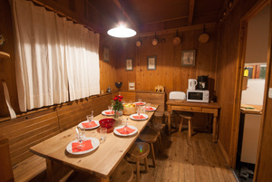 COIN REPAS :– 1 table(2,10m/0,77 m) – 2 banquettes-coffre d’angle – 8 tabourets – 1 suspension électrique – 1 étagère d’angle –1 table d'appoint (1m/0,54m) - 1 micro-onde – 1 cafetière NESPRESSO – 1 cafetière électrique – 1 grille pains – 1 bouilloire.