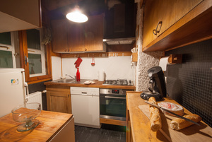 CUISINE : Frigidaire – four à pyrolyse – 3 feux gaz + 1 plaque électrique – 2 armoires suspendues – 1 meuble à tiroirs avec planche à découper - 1 meuble à 2 portes et 2 tiroirs.