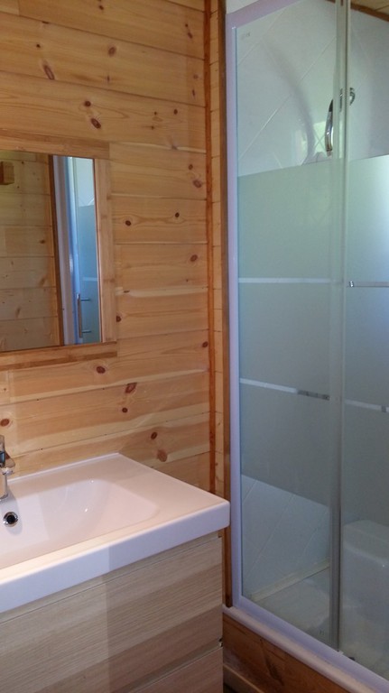 Cabine de douche avec porte coulissante – 1 meuble avec lavabo – 1 miroir.